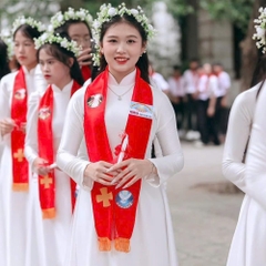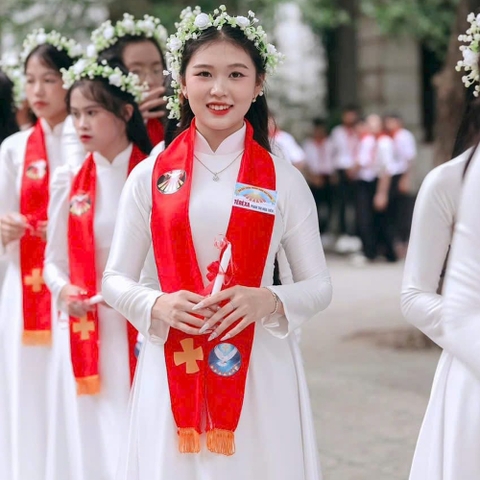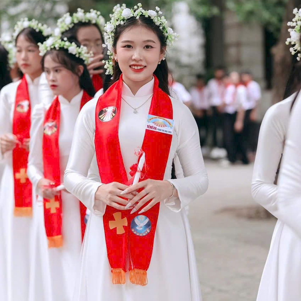 - Kích thước vừa vặn: Khăn có kích thước phù hợp, không quá dài cũng không quá ngắn, tạo sự thanh thoát và hài hòa với áo dài trắng truyền thống mà các em thường mặc trong lễ Thêm Sức.