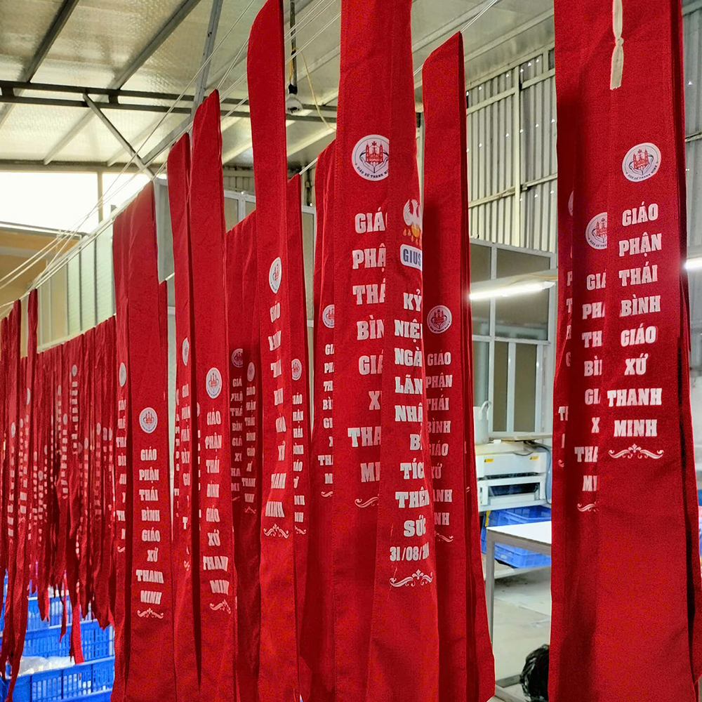 - Logo: Thêu biểu tượng Thánh Giá và Chúa Thánh Thần