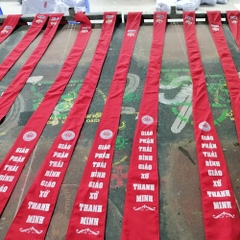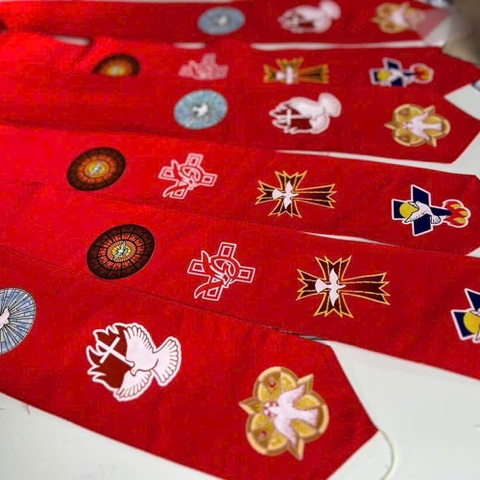 - Thiết kế tinh xảo: Mỗi chiếc khăn đều được thêu hoặc in các biểu tượng đặc trưng như Thánh Giá, ngọn lửa và bồ câu – dấu chỉ của Chúa Thánh Thần. Những chi tiết này không chỉ là trang trí mà còn mang ý nghĩa tôn giáo sâu sắc, là lời nhắc nhở các em về sức mạnh và sự dẫn dắt của Chúa Thánh Thần trong mọi bước đi của cuộc đời.